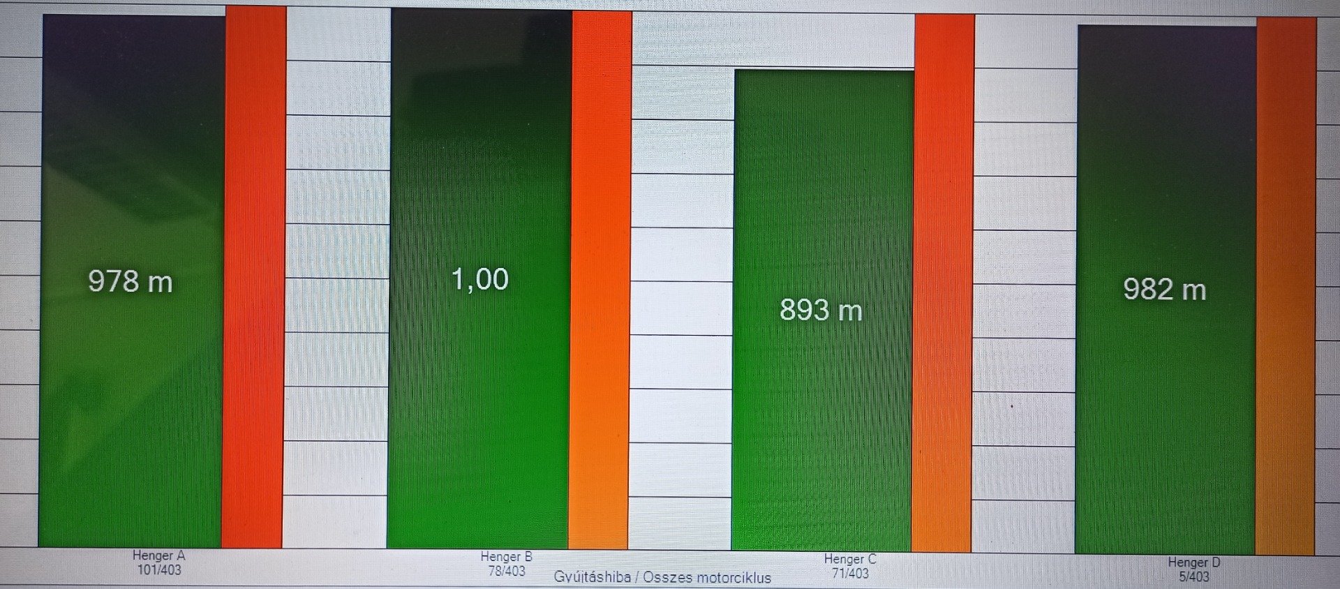 A fenti mérés megmutatja, hogy szelepnyitási problémák miatt változó nyomás mérhető minden hengernél. Ez mechanikai hibára utal a szelep, és annak mozgatásában résztvevő alkatrészekre nézve.