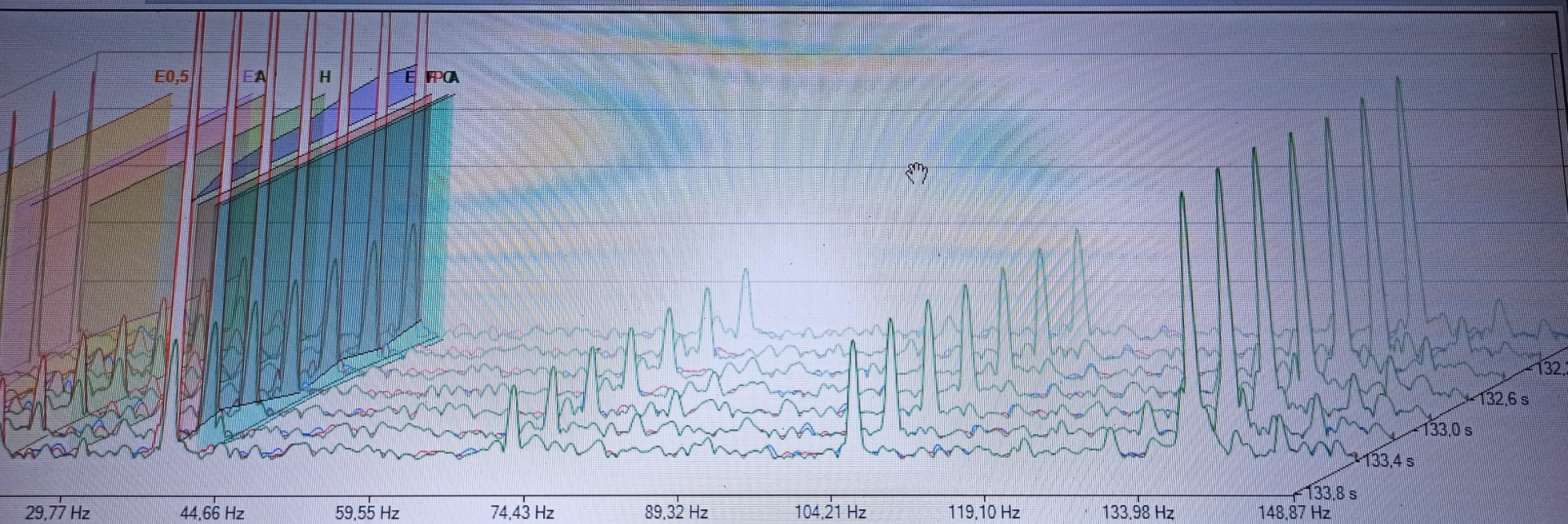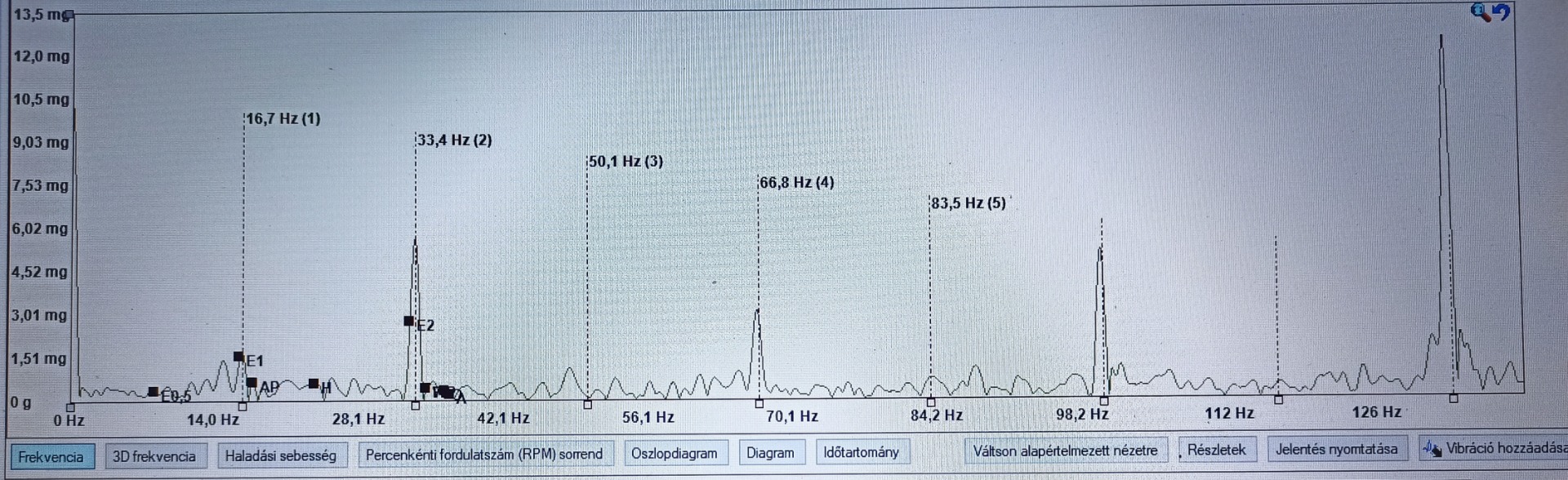Az első mérésből már látom a hiba "helyét". Szeretném más irányból is bizonyítani annak hibáját. A következő képen jól látszik a zaj "vándorlása" ami a nyikorgó hangot alkotja.