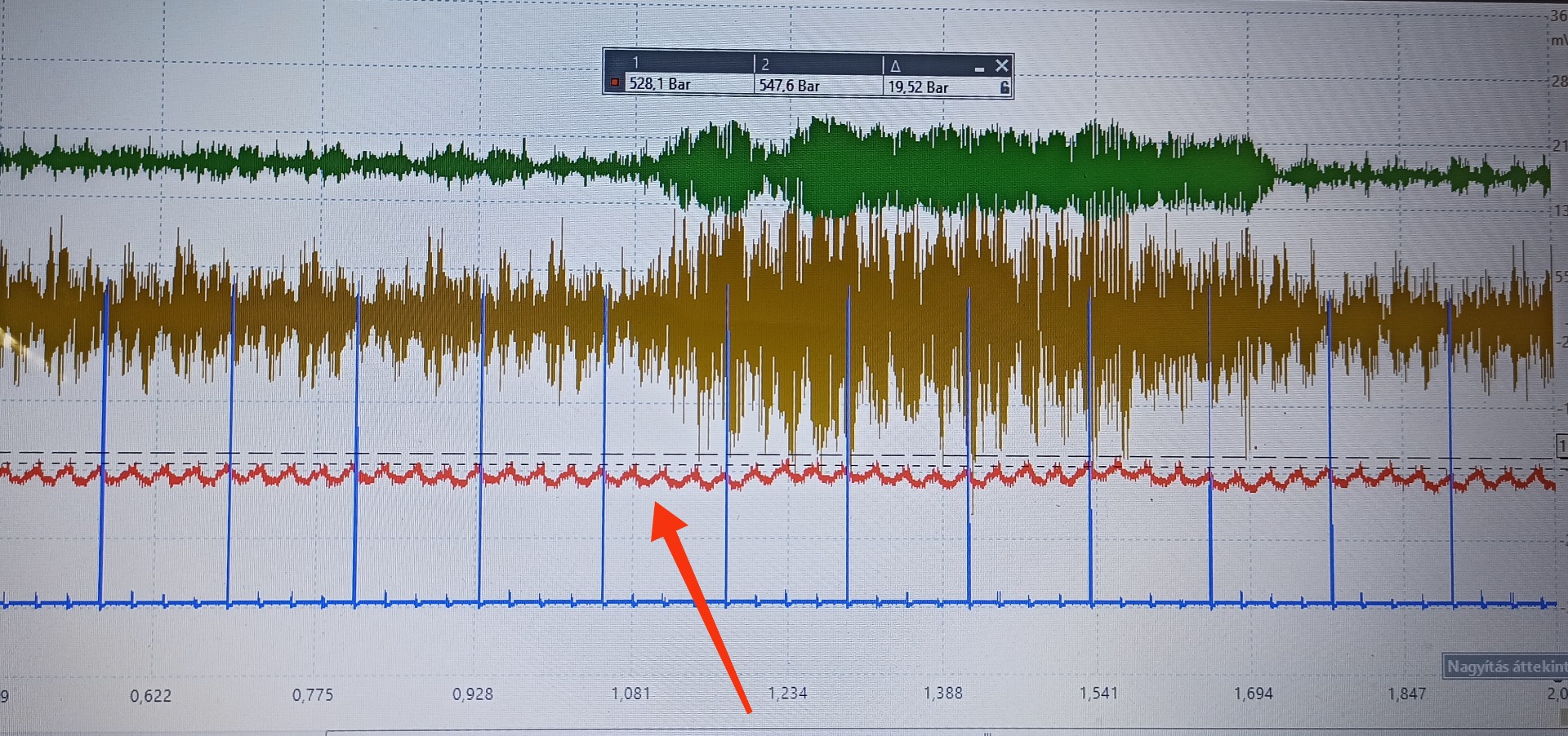 A piros nyílnál esik a rail nyomás, pont ott ahol a zaj is megjelenik. Majd ameddig a zaj tart a rail nyomás 20 bar-os ingadozása látható. A hang elmúlásával a rail nyomás ismét stabil lett.
