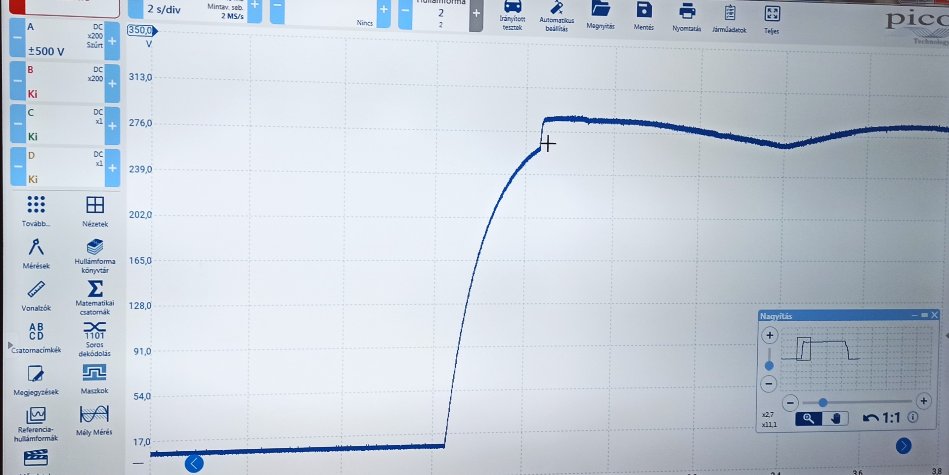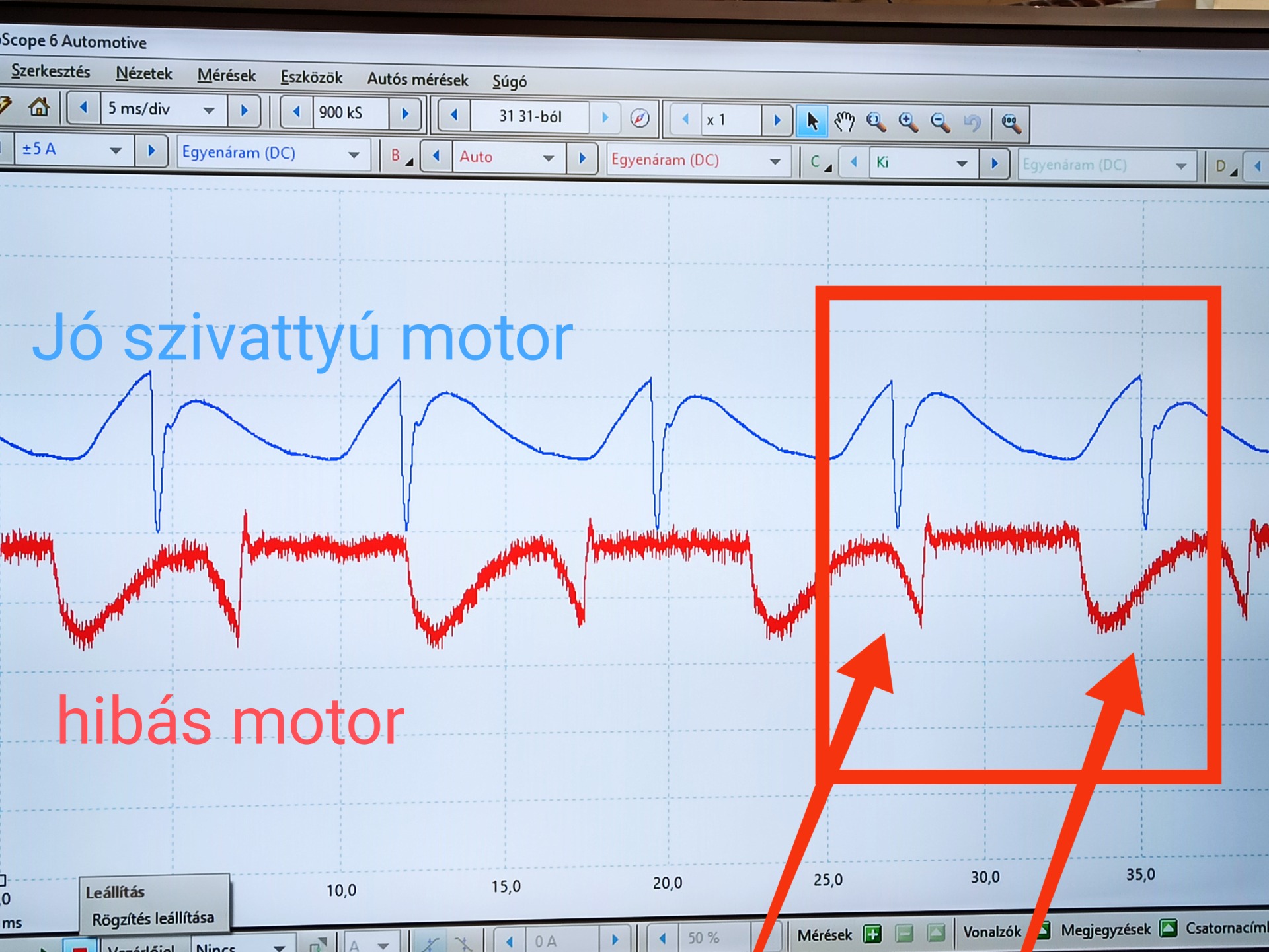 Oszcilloszkópos méréssel igazolható, hogy hibás a szivattyú. Csere után a mérést ismét elvégeztem. Látható a hibás, és a jó motor mérése.